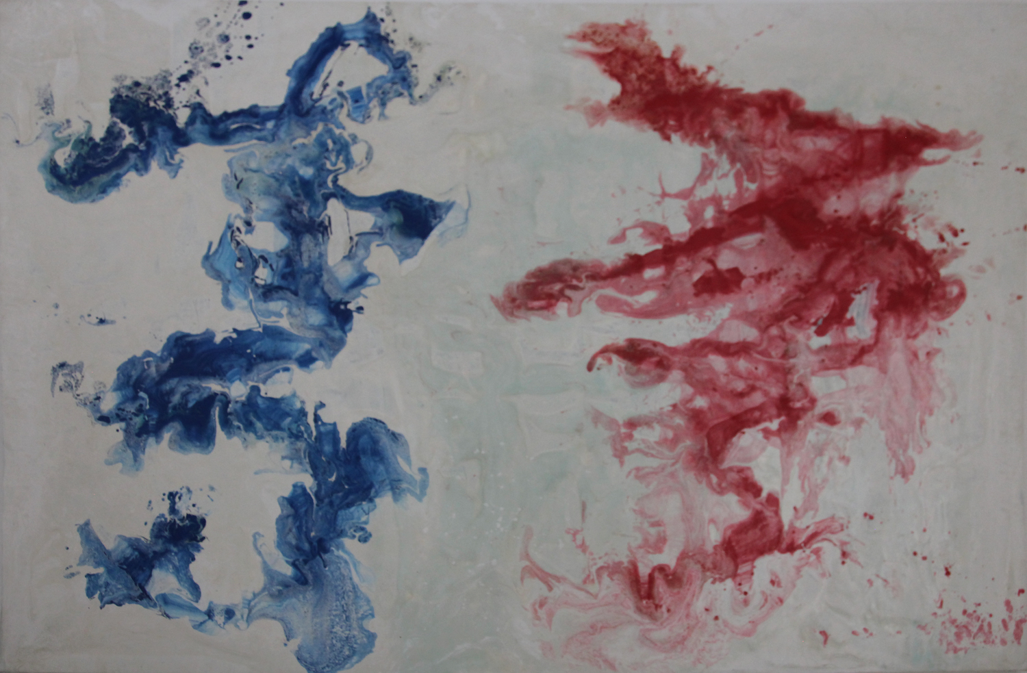 White acrylic paint was applied on canvas as a base layer. Before the base layer was air-dried, a mop was used, with blue and red acrylic paint respectively, for splashing and for writing a phrase: “high cloud.”