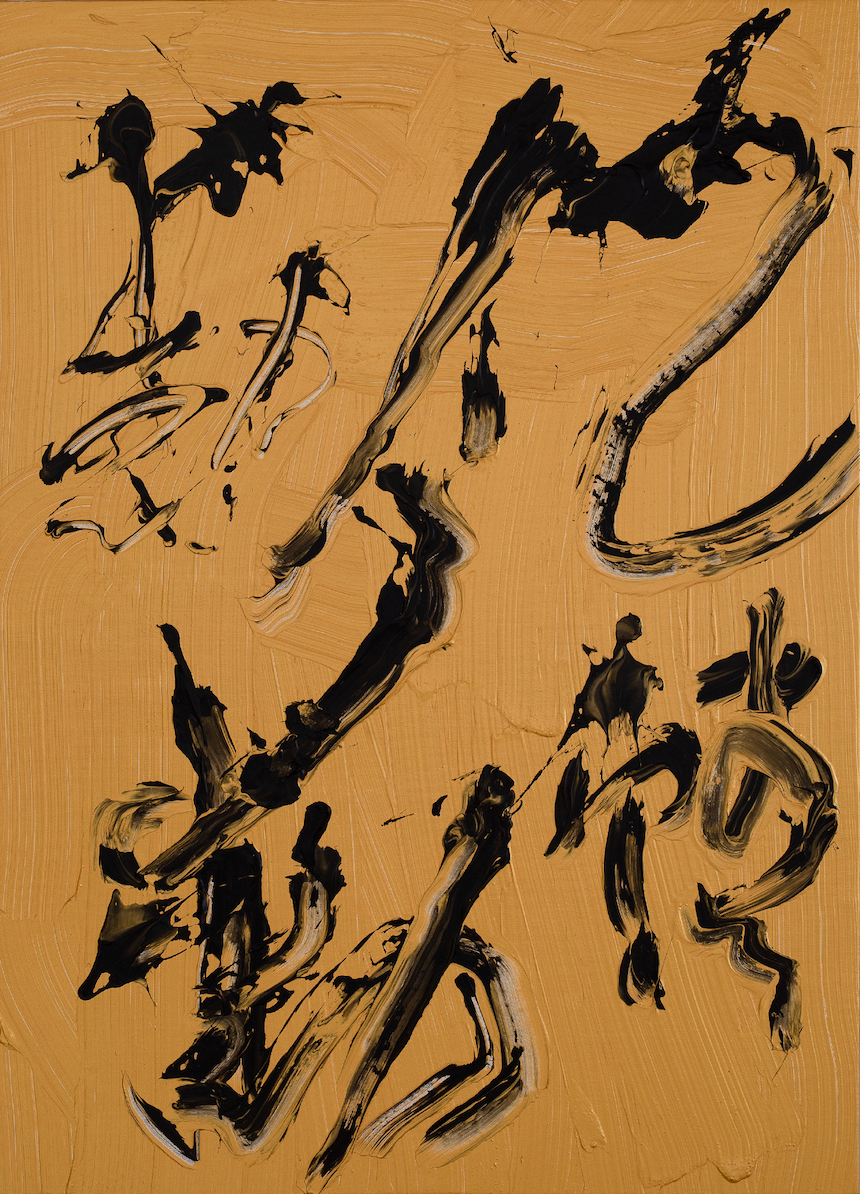 Gold acrylic paint was applied on canvas as a base layer. Before the base layer was air-dried, with black acrylic paint using a specially made paintbrush, associated with splashing gestures, a sentence “is it the wind blowing or the pataka flapping?” (Platform Sutra of the Sixth Patriarch) was written on top of it.