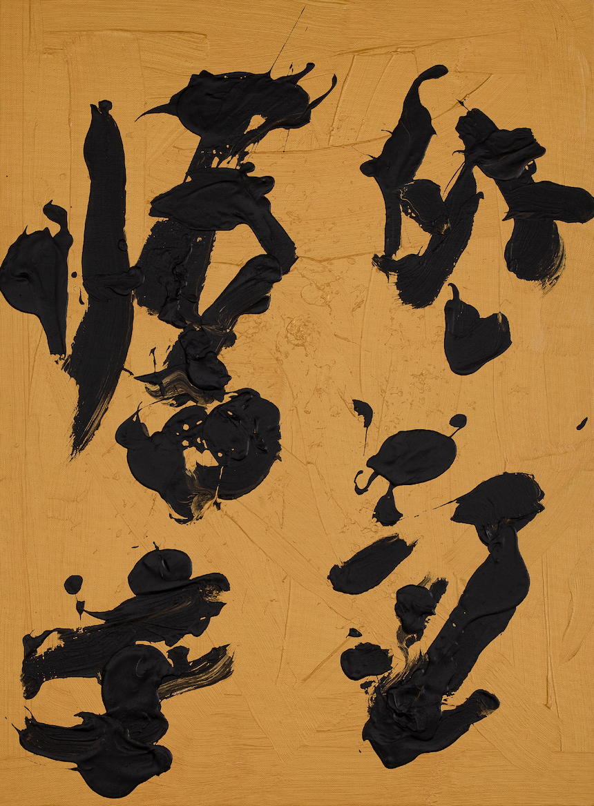 Gold acrylic paint was applied on canvas as a base layer. Before the base layer was air-dried, with black acrylic paint using a specially made paintbrush, associated with splashing gestures, a phrase “awakening to self-deliverance” (Platform Sutra of the Sixth Patriarch) was written on top of it.