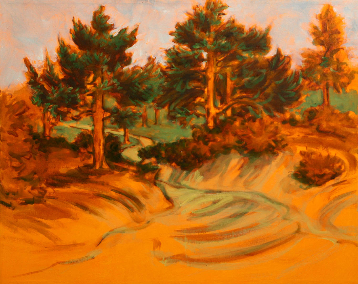 Fluorescent orange egg/oil emulsion; burnt siena, lead antimonate, green earth, verdigris, lead white, bone black in oils on board, 61 × 50 cm, 2009