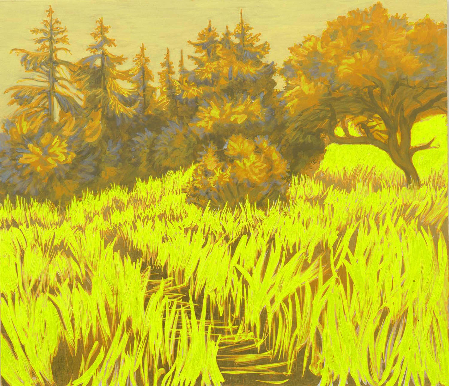 Fluorescent orange yellow egg/oil emulsion; burnt siena, lead antimonate, verdigris, smalt, lead white, shiet gel in oils on canvas, 92 × 93 cm, 2009