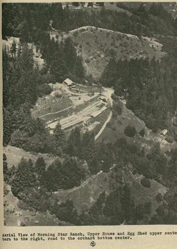 Aerial view of Morning Star Ranch. In the upper center of the photo are the Upper House and Egg Shed.