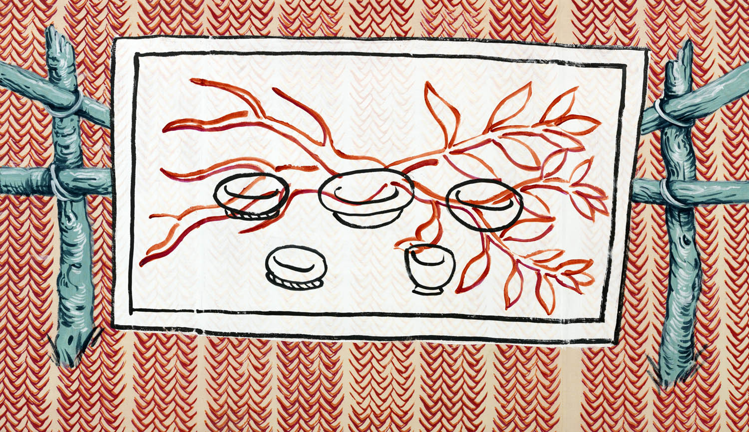 Mayan blue made from woad, woad indigo, titanium white, madder, cochineal, ink and gesso, on calico mordant printed with cochineal and madder,