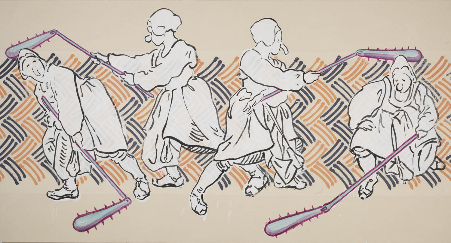 Mayan blue made from woad, cochineal, ink, and gesso, on calico mordant printed with madder and logwood