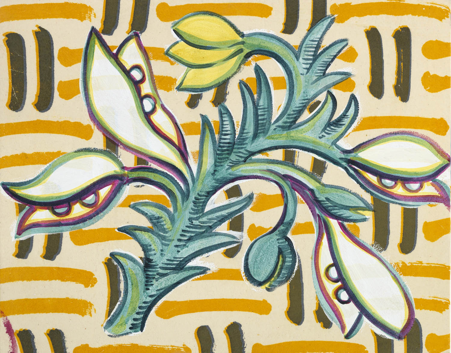 Mayan blue made from woad, cochineal, aliaga (genista), and gesso, on calico mordant printed with logwood and dyer’s broom (genista), on board