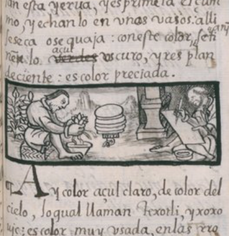 Sigrid used woad to make Mayan blue, a pigment that demonstrates the maximal hybridity. This striking pigment is made from tropical indigo plants (in a language of the Aztecs, Navajo, it’s called xuiquílitl) native to Central America. It was made using the unique craft of the Indians and has excellent stability. The Mayans invented Mayan Blue pigments around 700 CE which eventually became widely used in Central America. The clues of the methods of making Mayan Blue can be found in the images in The General History of Things of New Spain, otherwise known as the Florentine codex is the most complete manuscript that has all these records, it was created collaboratively by Fray Sahagún and a group of anonymous indigenous (painters / scribes) around 1575-1577. It is the world's first ethnographic work, consisting of twelve volumes of illustrations, including the daily life, religious and political customs of the Nahua, and the natural history of animals, plants and minerals of Mexico, written in Spanish and alphabetized Náhuatl. Chapter Ⅺ of this book is dedicated to the delineation of fine pigments obtained from plants for painting and dyeing, including the illustration of tropical indigo (xuiquílitl) used to make Mayan blue.