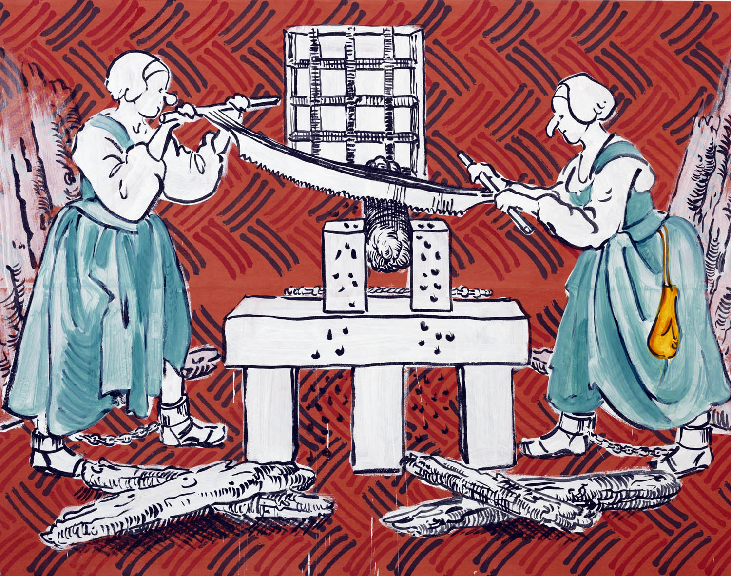 Mayan blue made from woad, ochre, aliaga, ink and gesso on calico mordant printed and dyed with madder, logwood and cochineal, on board