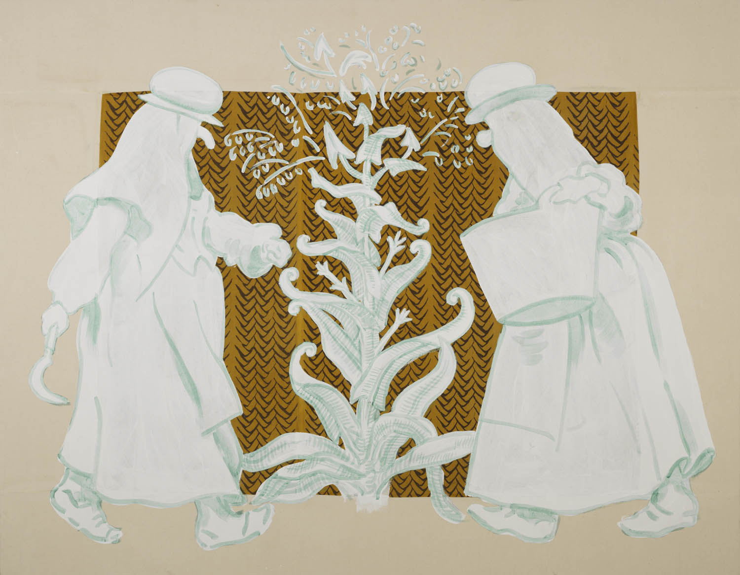 Mayan blue made from woad and gesso, on calico mordant printed with buckthorn berries, on board