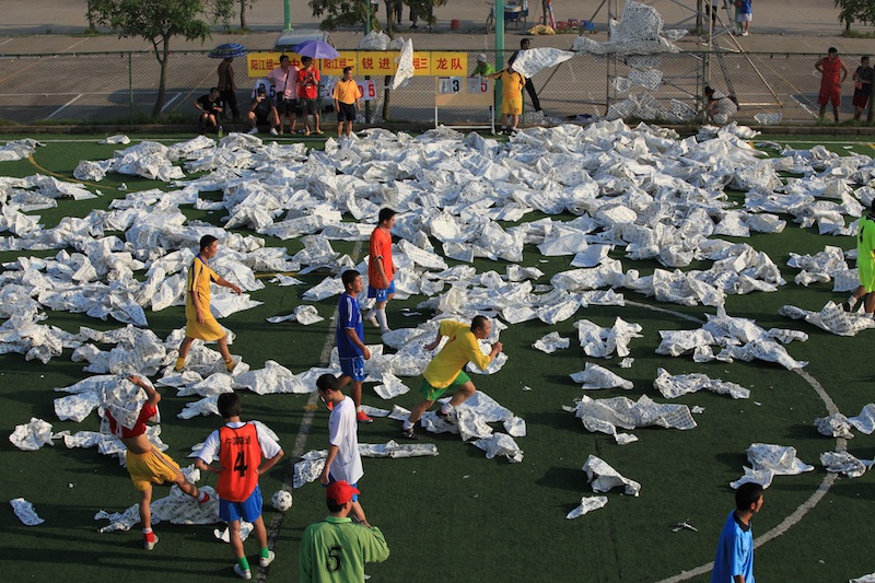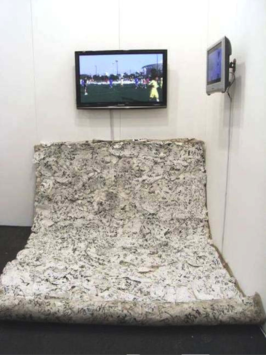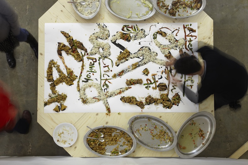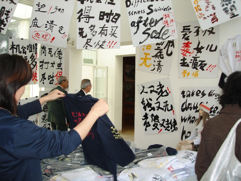 Calligraphy works as a metaphor for Yangjiang Group to indicate the unpredictability, the mistery the chances hidden under the surface of a materialistic and confusing world. In their art practice there is no fixed form. Elements from  everyday life – news talks, gambling, soccer games, discount sales etc.etc. – give birth to a new approach of making calligraphy. Time and materials are transformed into a comprehensive situation by the fermentation of interaction with wine, tea, discourses and daily situations. For example, in the work Fan Hou Shu Fa (After Meal Calligraphy), the artists turned an ordinary household dinner into a spontaneous theatre in a public space. The leftovers became the key material to create calligraphy. Food integrates with art , as an experiment to connect spirituality and the materialistic world. The content of the calligraphy worked as a motto to reflect the relation between human activities and the surroundings within the process of the performance.