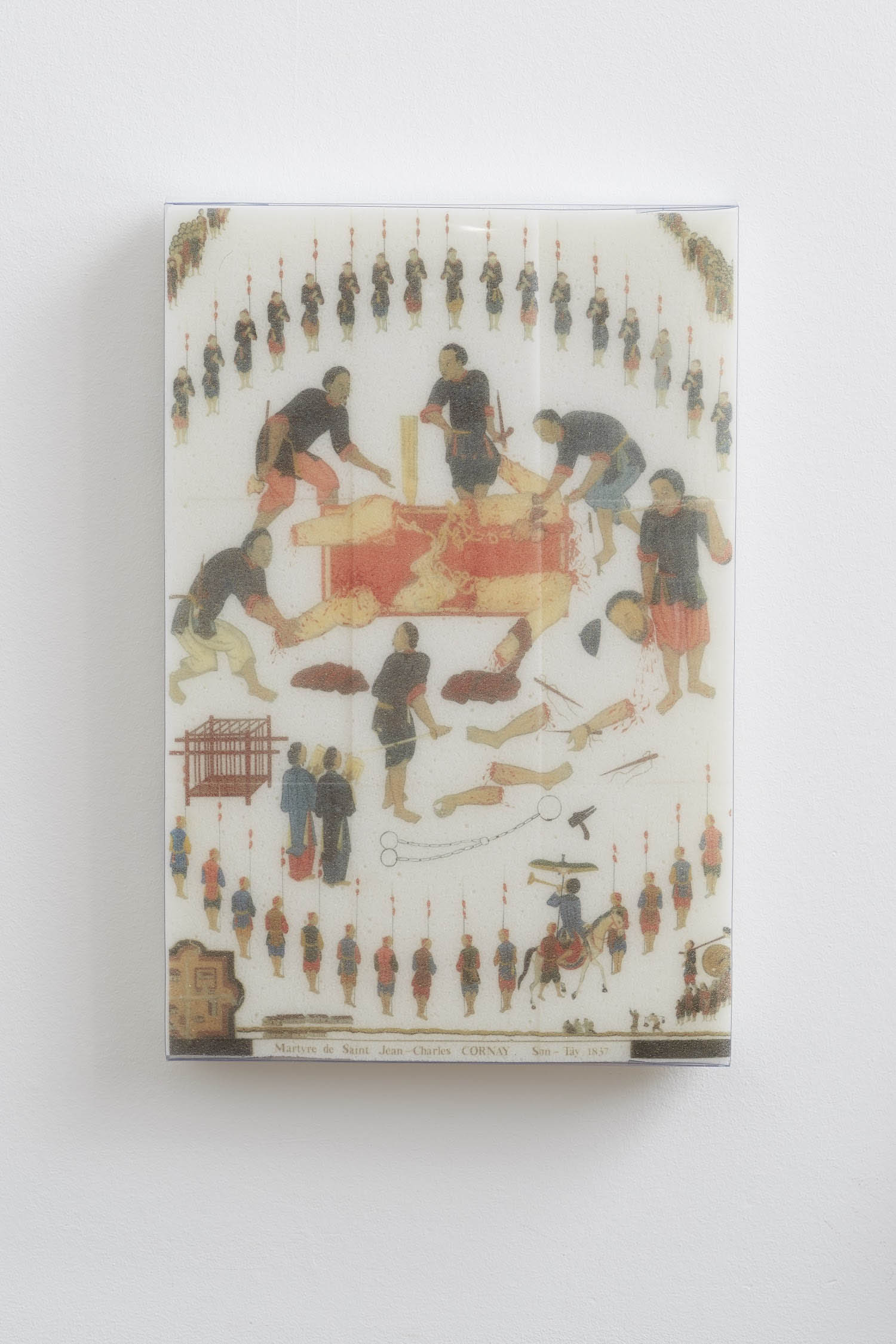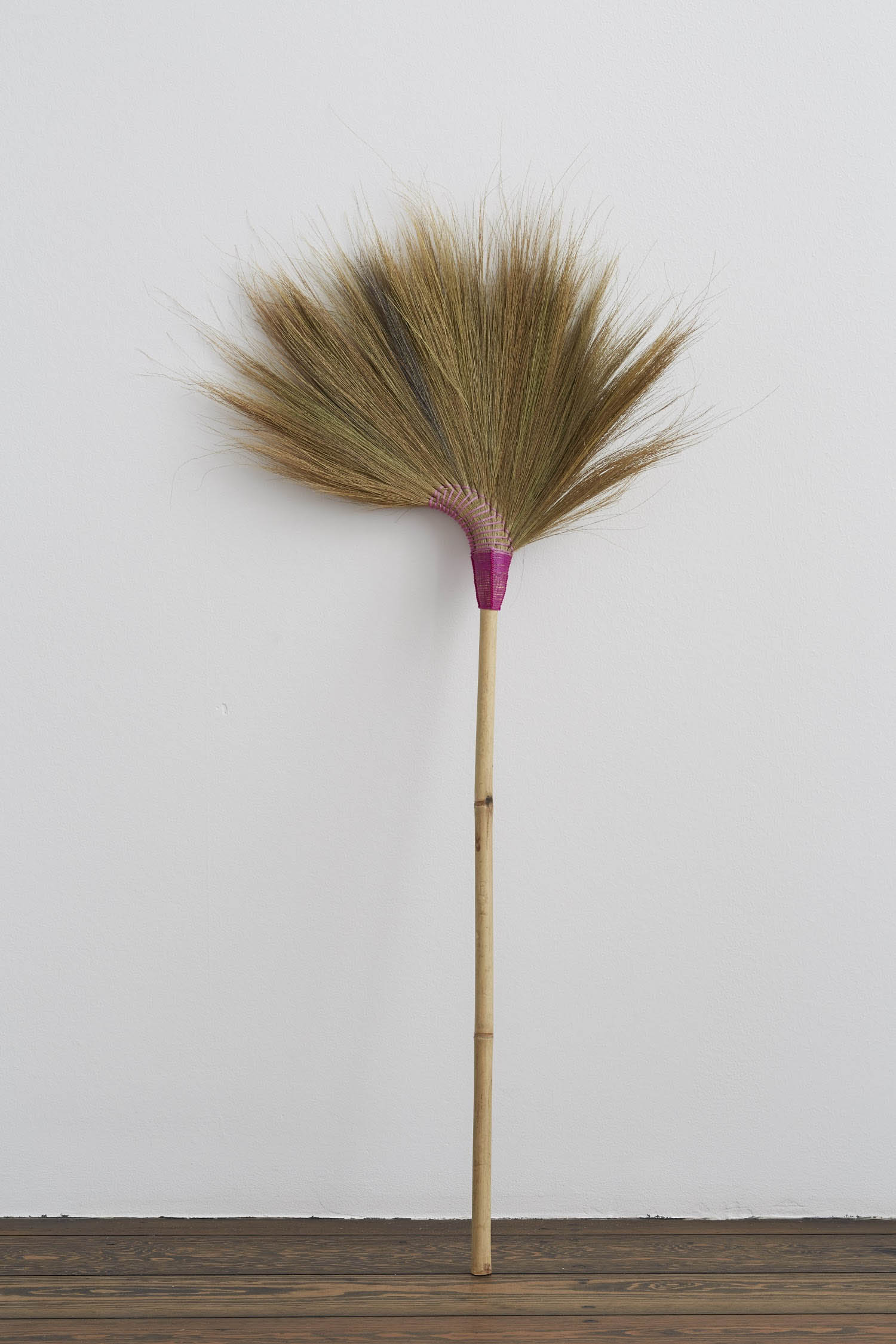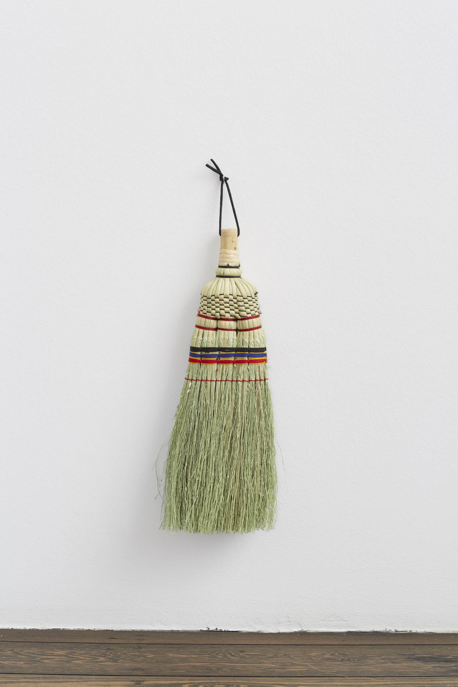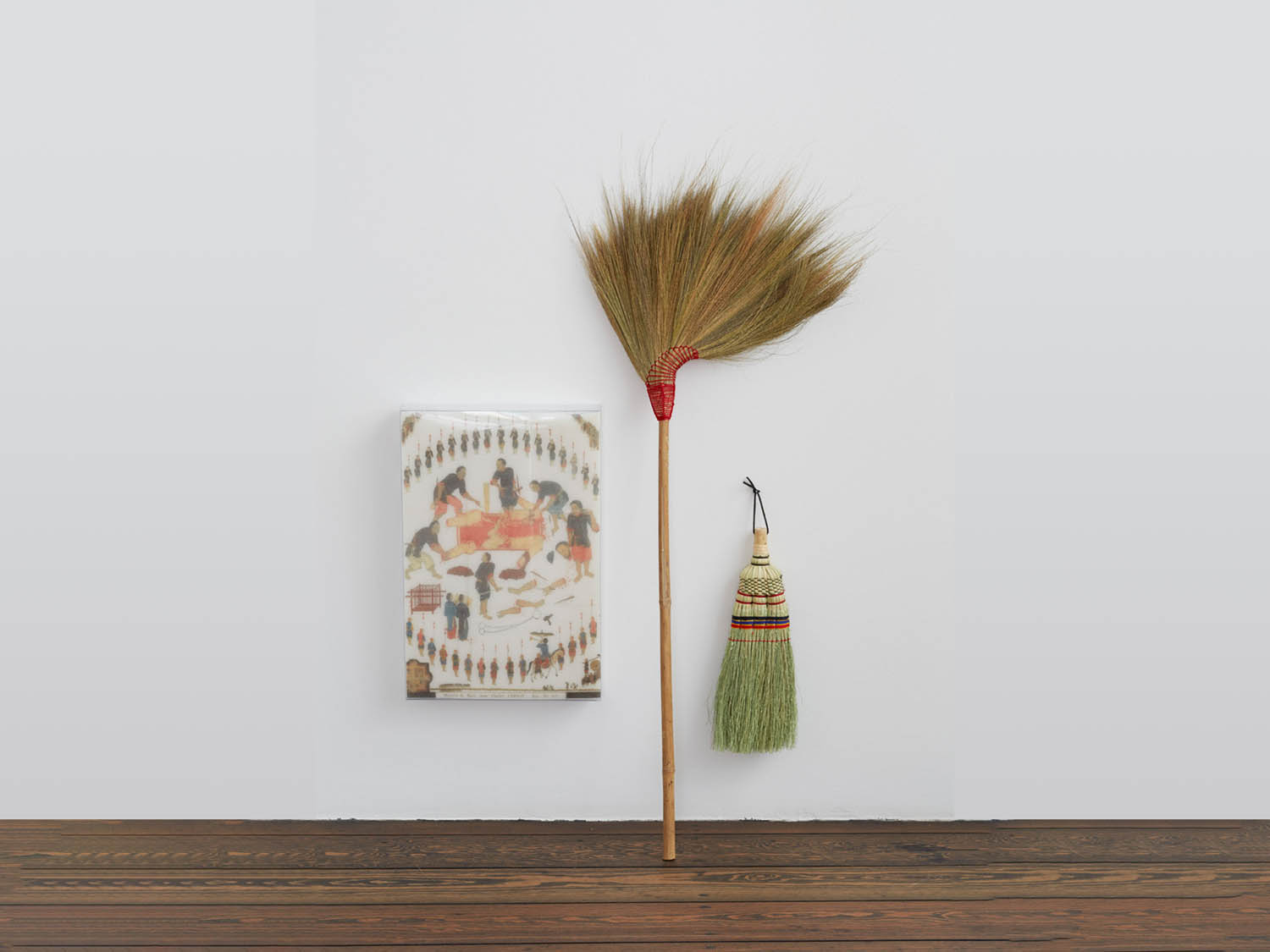 Assembled by artist Danh Vo, and in a sense authored by him, these brooms and sponges are not so much art objects as aesthetically appealing tools. Accompanying two Thai brooms are nine sponges packed in a pragmatic transparent, plastic box printed with a motif of The Martyrdom of Jean Charles Cornay c. 1837. The delicate painting depicts the gruesome beheading and dismemberment of Cornay, a French missionary to Vietnam who inspired a generation to pursue his work including Jean-Théophane Vénard who features in a number of Vo’s works. As Vietnamese Catholics, Vo’s family inherited the colonial program of these zealous missionaries. Vo has used this painting in a number of other non-art contexts, including printed on baby onesies. It is as if he is taking the Western penchant for appropriating unthreatening Asian visual culture, and asked, “If you like that image, why not enjoy this one, which points to the actual violence inherent to cultural expansion and exchange?” With Vo’s pan-asian sourcing, the brooms and sponges might be an allegory for the cleansing of the past and an embrace of the new. However, as Vo enjoys allowing things to exist in parallel without overthinking them, it is more likely that the sponges are there to wipe the grime from our bathtubs, and the brooms to sweep the remains of our day.
