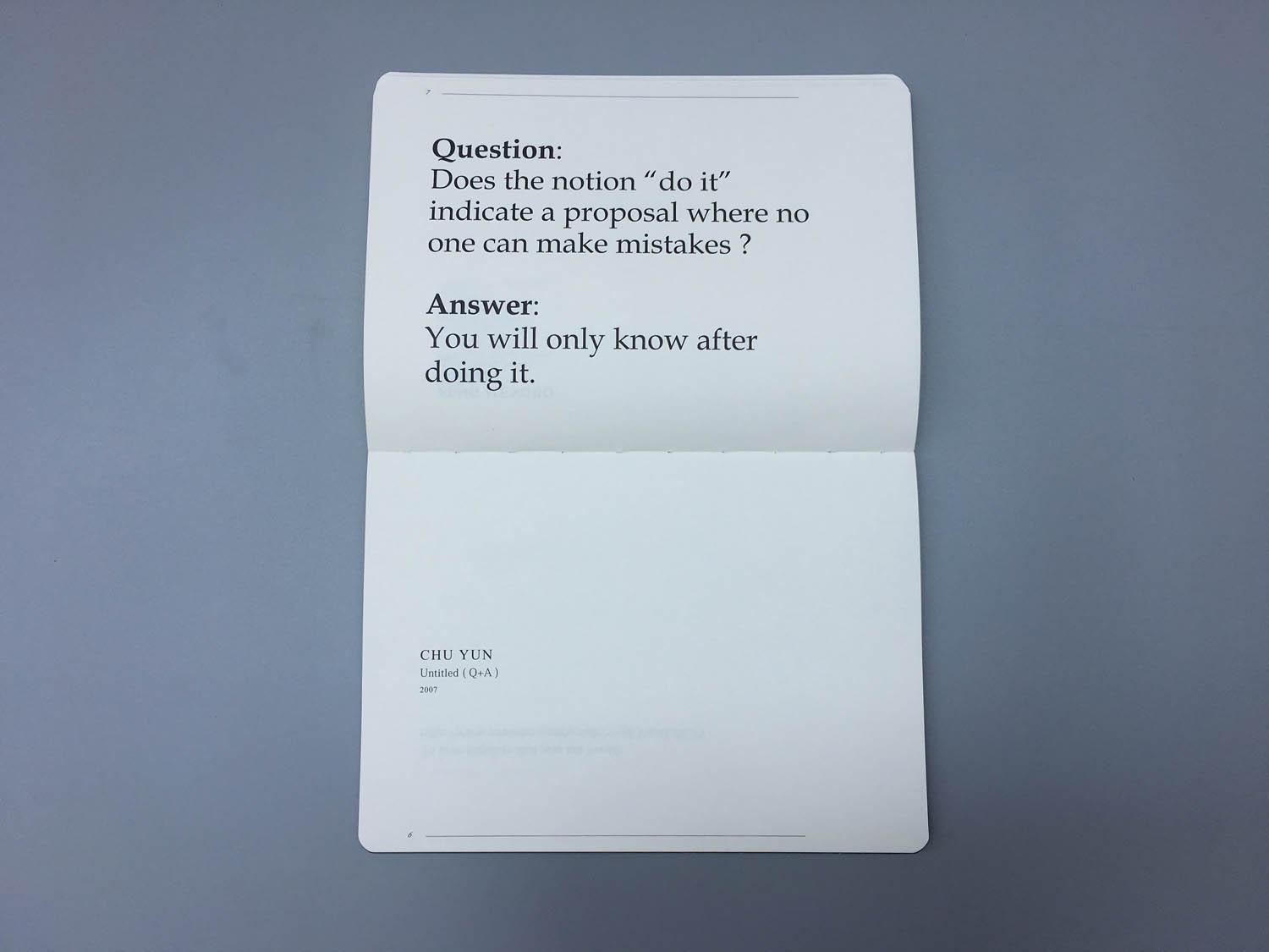 Co-edited by Hu Fang and Hans Ulrich Obrist, do it (Chinese edition) is the most up-to-date development of do it project, it includes new contributions of do it proposals from 26 energetic artists from China/ within Chinese context, they open the new possibility to the Possible Life.