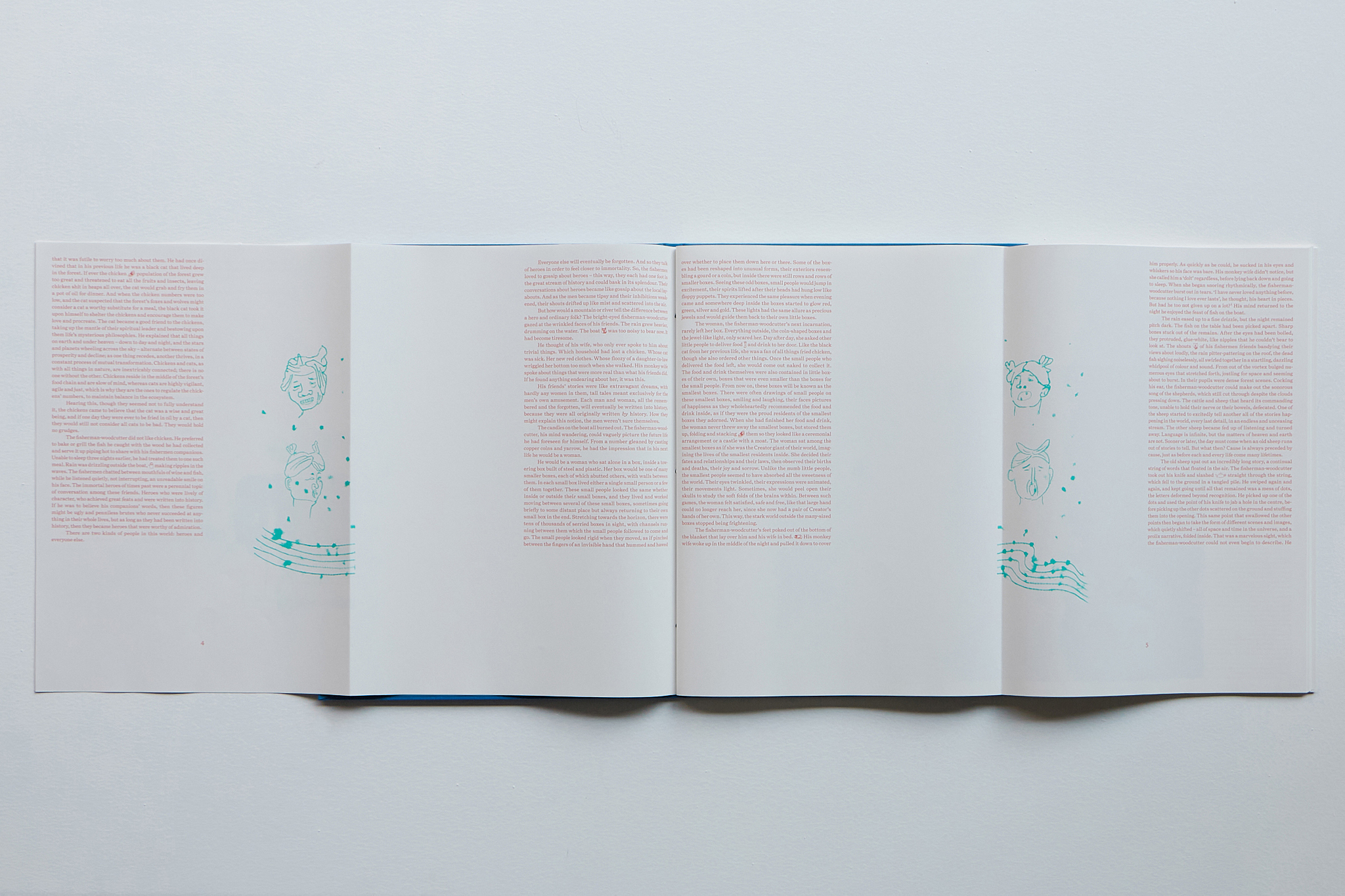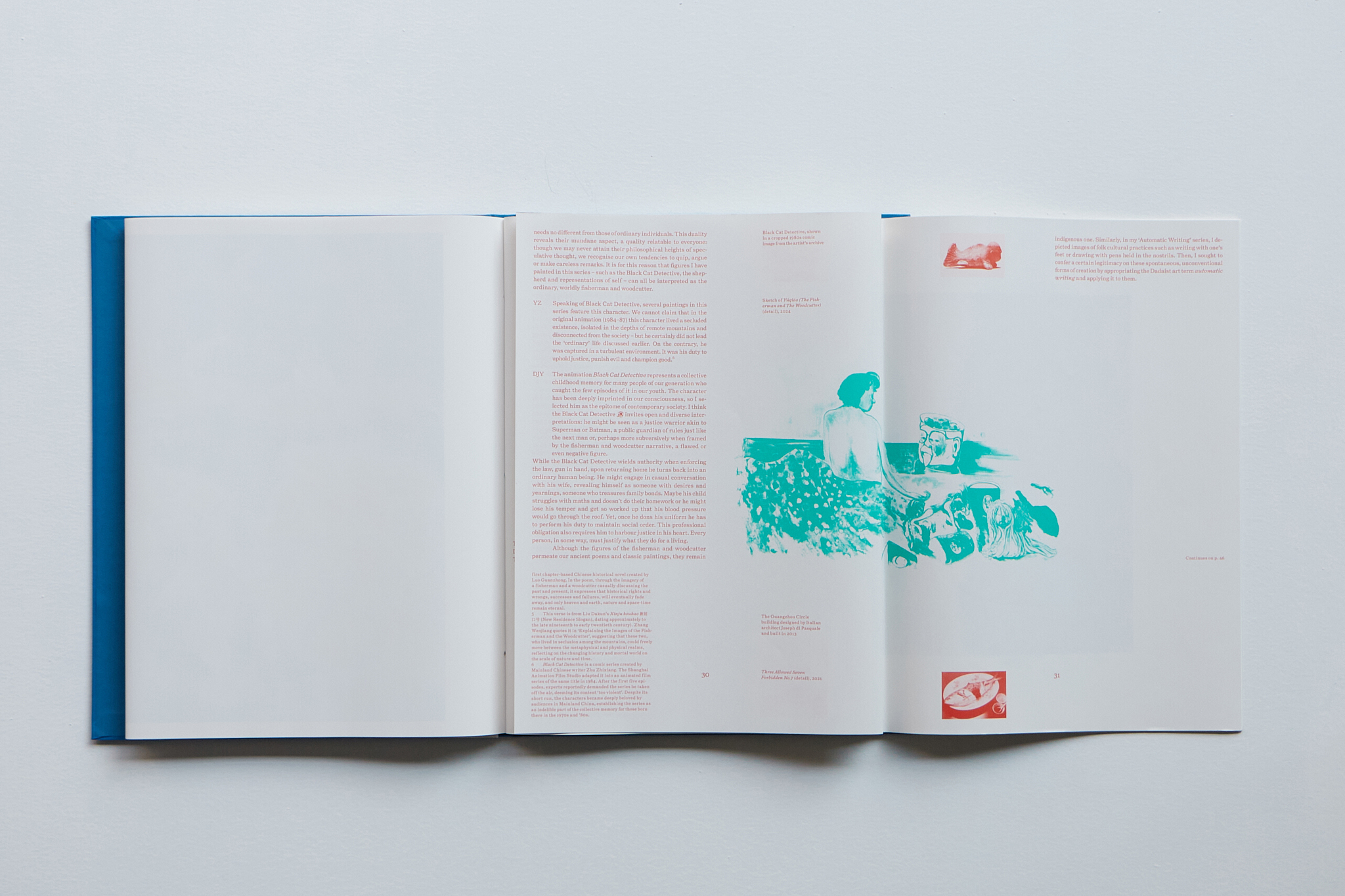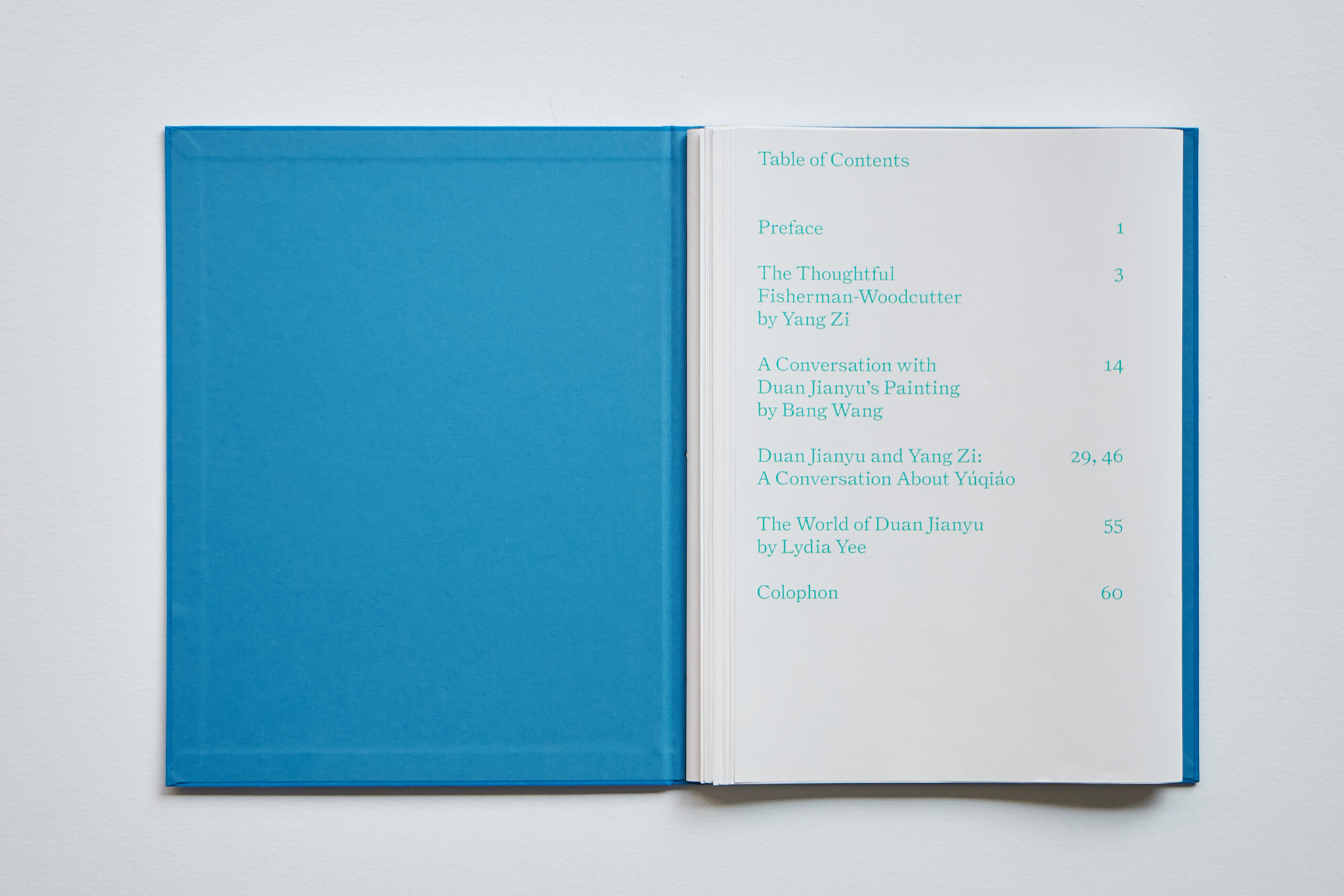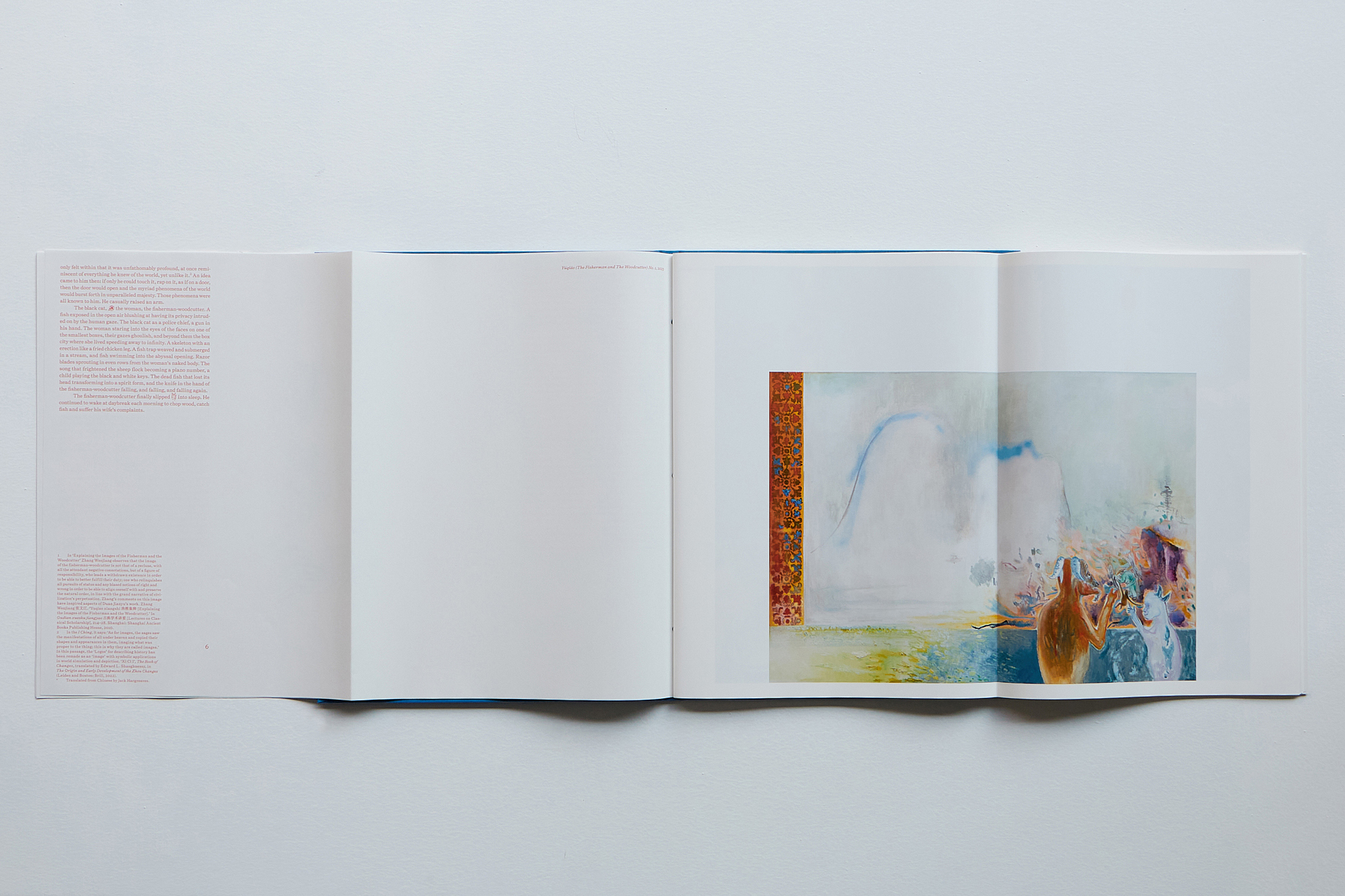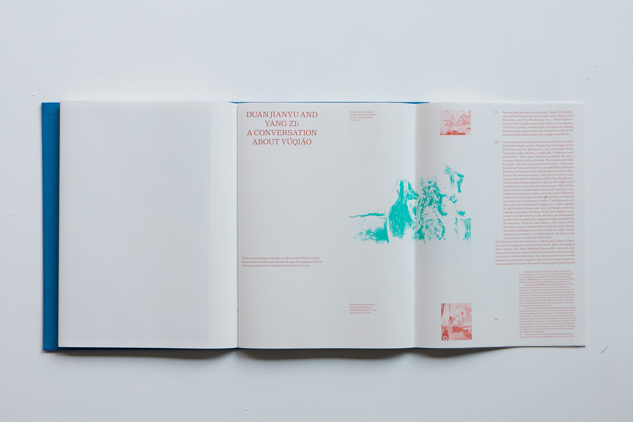 The title of the publication is taken from Duan Jianyu’s most recent body of work, Yúqiáo, a term that translates as “the fisherman and the woodcutter.” This duo recurs as a motif in Chinese literati painting and philosophy dating back to the eleventh century. Traditionally imagined as two reclusive figures dwelling along rivers and foothills, they serve as wise observers who reflect on the human condition from a contemplative distance. Yúqiáo embodies a unity of thought and practice, offering a holistic cosmology that views time, nature and history with a transcendent, non-binary perspective.