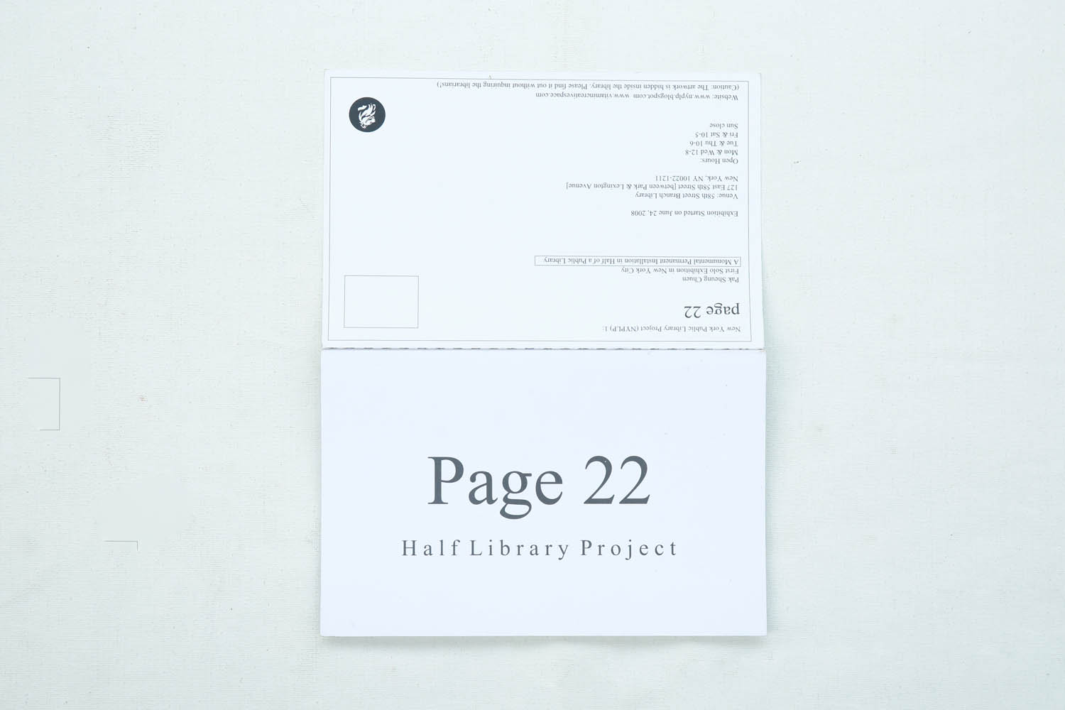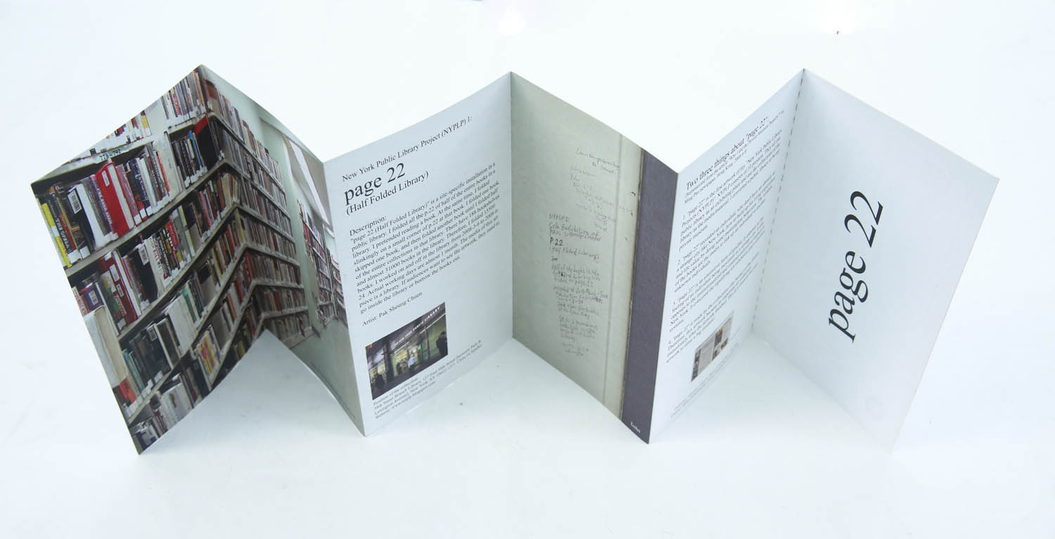 “Page 22 (Half Folded Library)” is a site-specific installation in a public library. I folded all the p.22 of half of the entire books in a library. I pretended reading a book. At the same time, I folded slinkingly on a small corner of p.22 at that book. I folded one book, skipped one book, and then folded another book until I folded half of the entire collections in that library. There have 188 bookshelves and almost 31000 books in the library. Therefore, 15500 books were folded. I worked on and off in the library from 2008-3-6 to 2008-6-24. Actual working days are almost 1 month. The media of this art piece is a library. If audiences want to see the artwork, they need to go inside the library or borrow the books out.