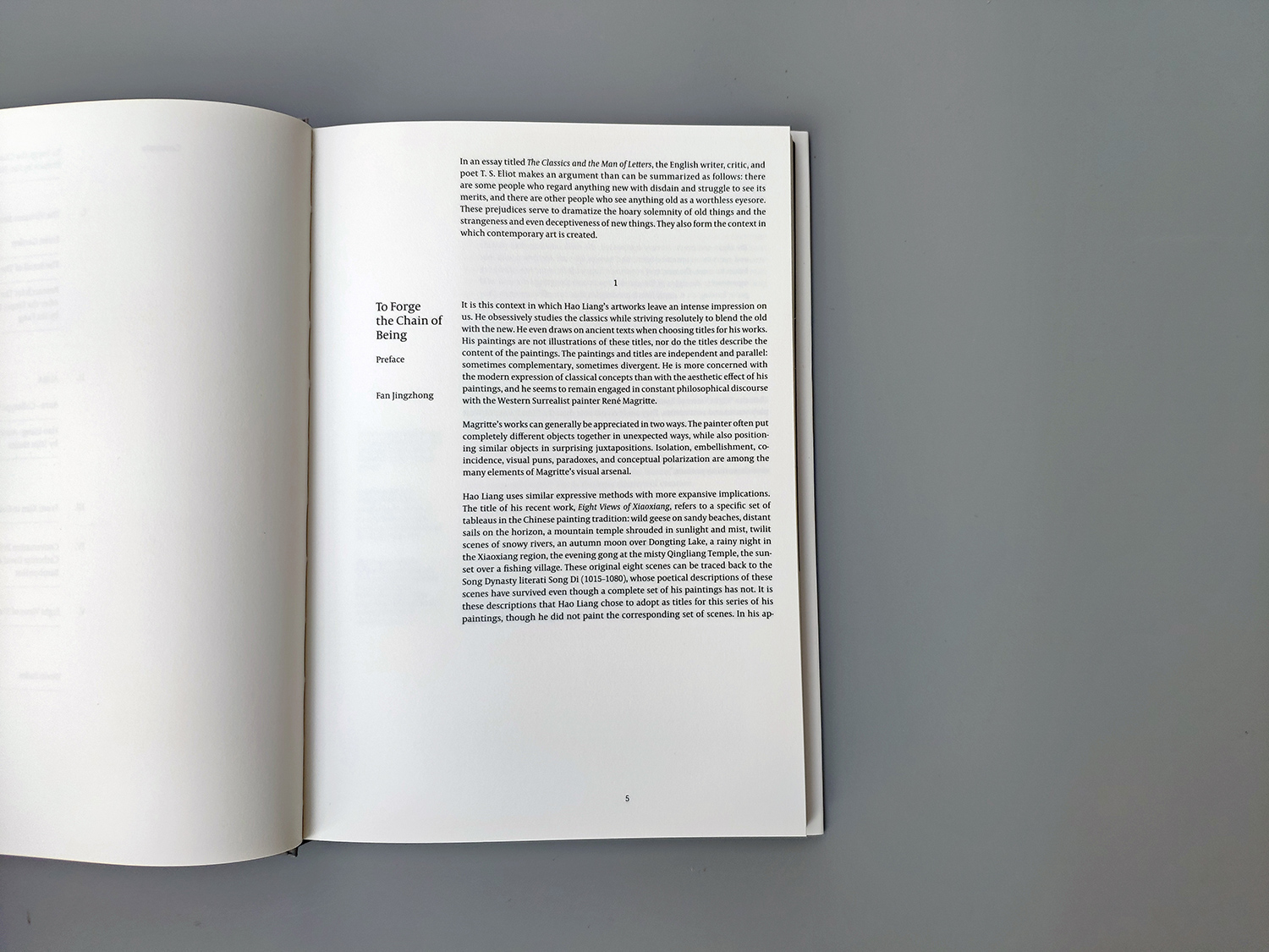 Haoliang: The Virtuous Being weaves together multiple threads to present and ponder upon Hao Liang’s creative practice in the recent years. These threads sometimes run parallel with one another, other times progress or return from one to another. This book starts from The Virtuous Being created between the years of 2013 and 2015, then enters the space of From Xian to Gui via The Aura, created in 2016, and ends with The Eight Views of Xiaoxiang as a gradual fade-out.